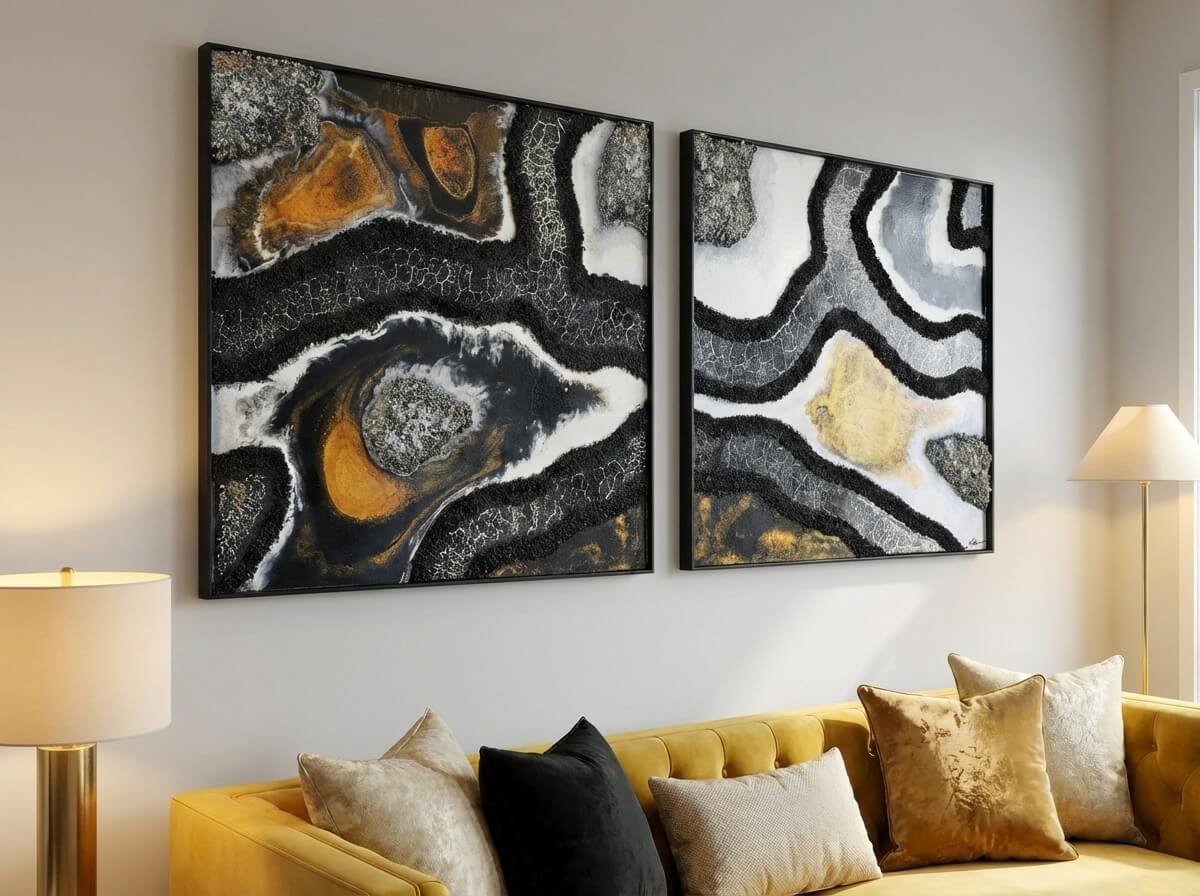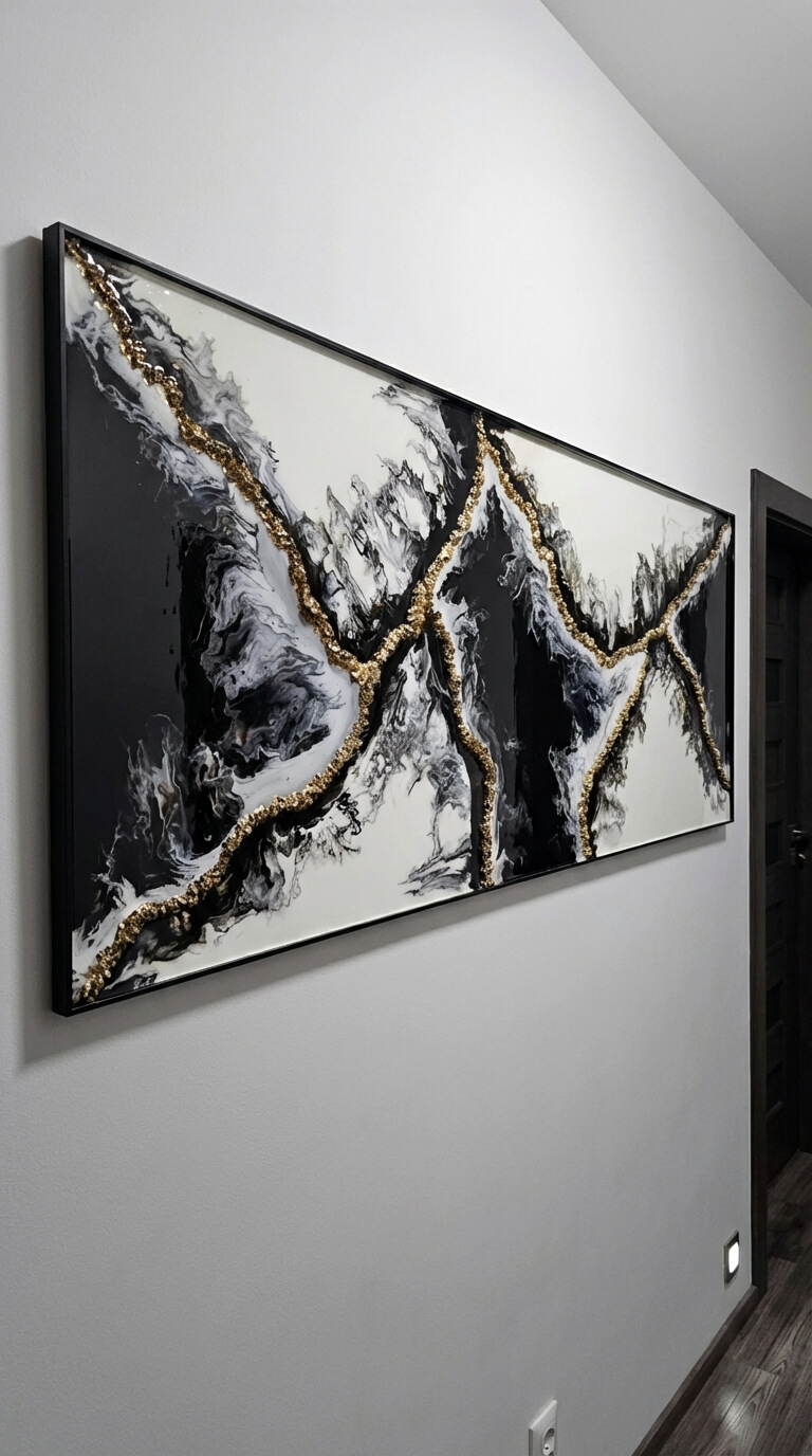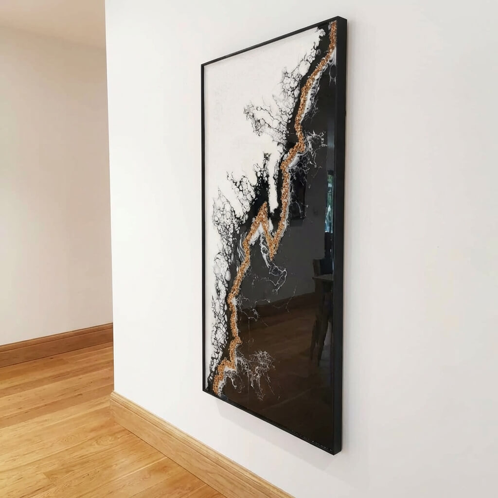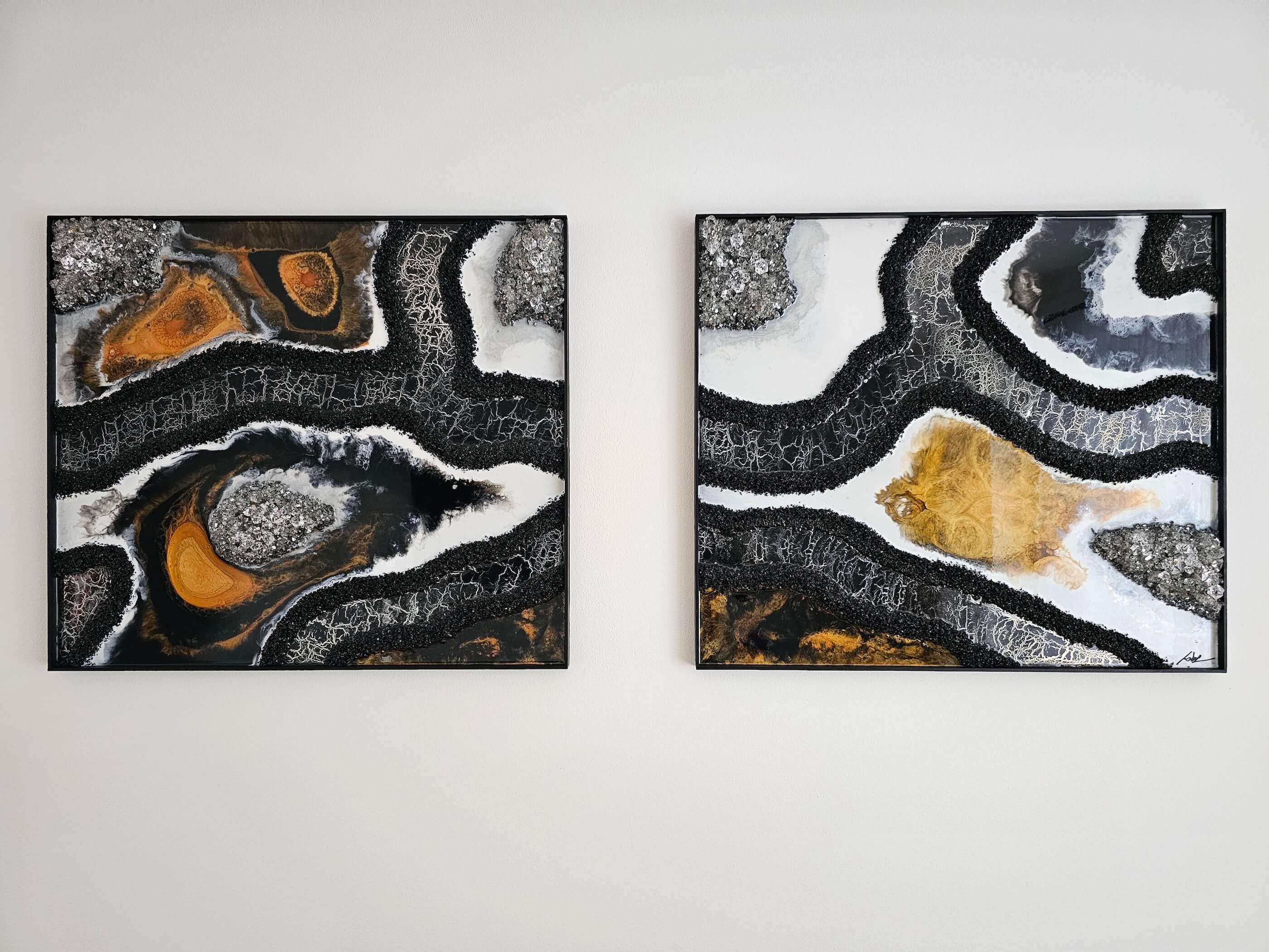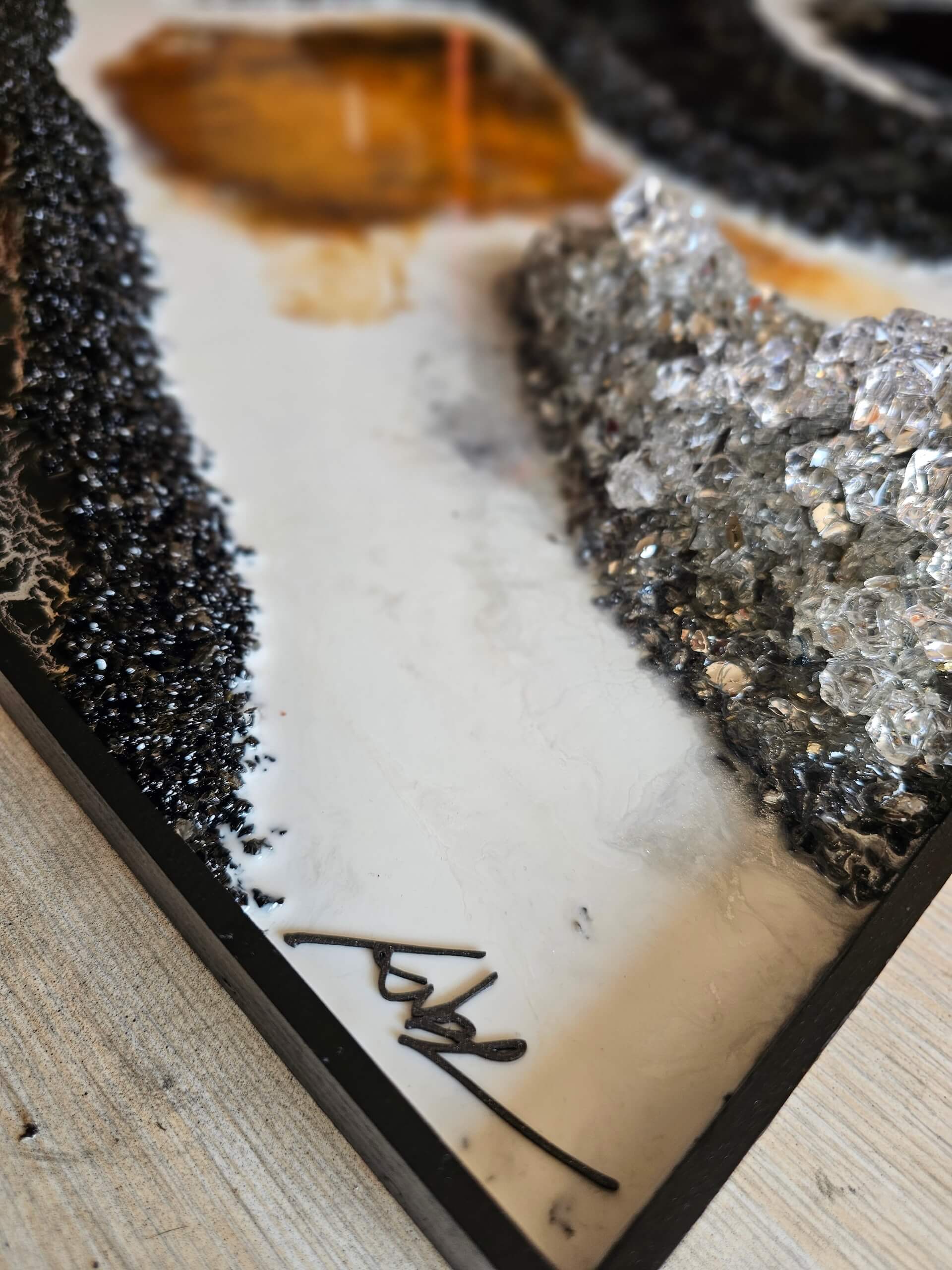 In this two-piece resin wall art, I combined deep black and pure white with striking 3D structures made of crushed glass. The organic lines and golden details resemble a slice of a precious stone. The result is a piece of modern abstract art that adds luxurious depth to any interior.