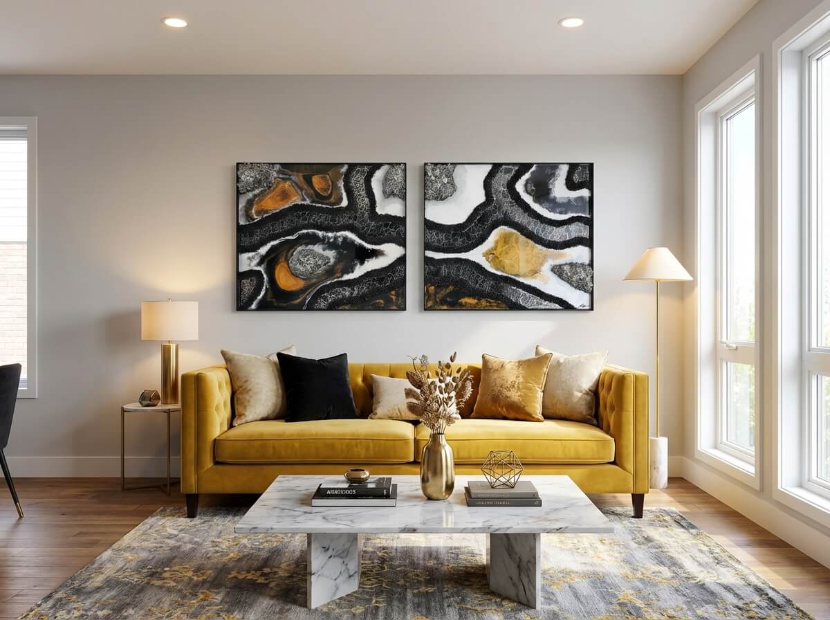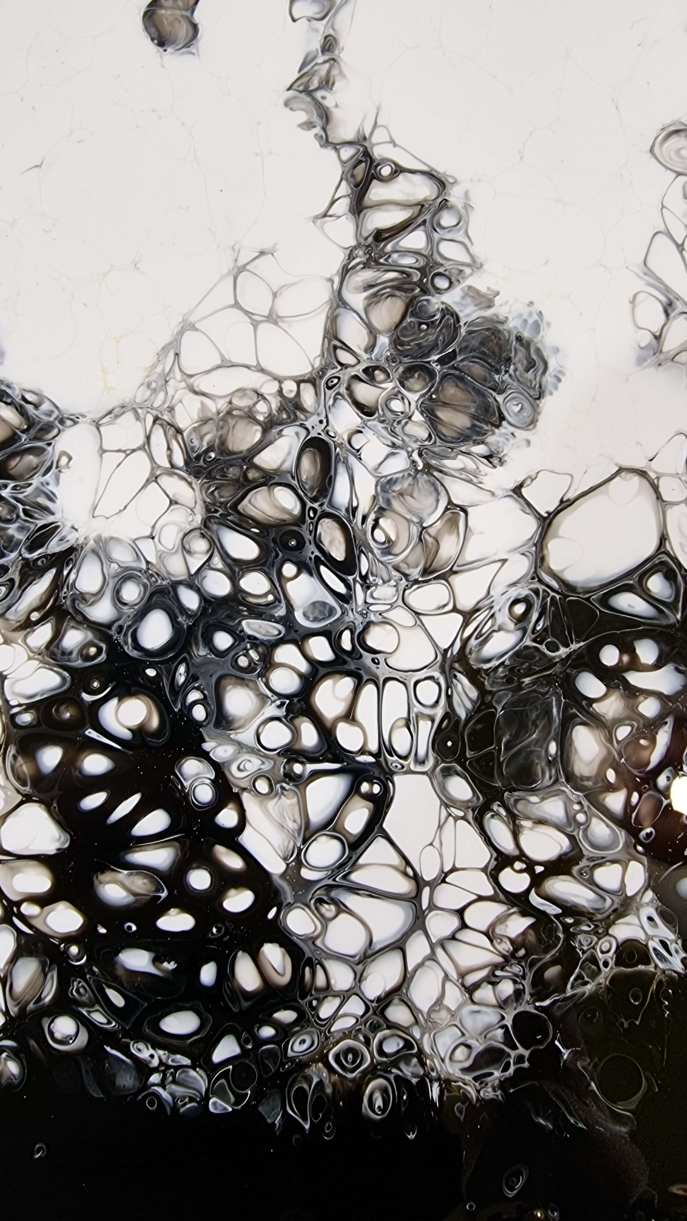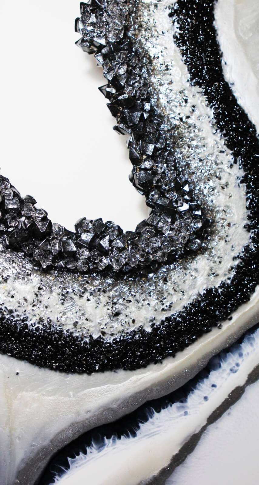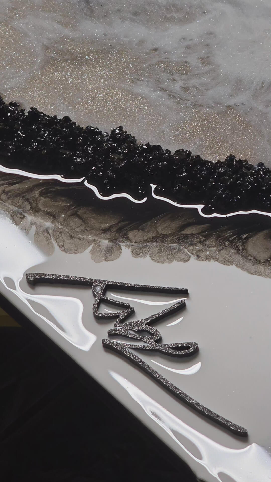 In this two-piece resin wall art, I combined deep black and pure white with striking 3D structures made of crushed glass. The organic lines and golden details resemble a slice of a precious stone. The result is a piece of modern abstract art that adds luxurious depth to any interior.