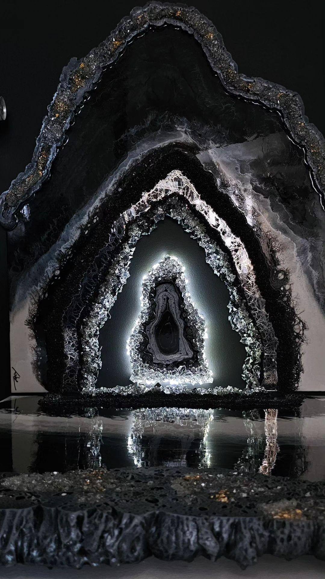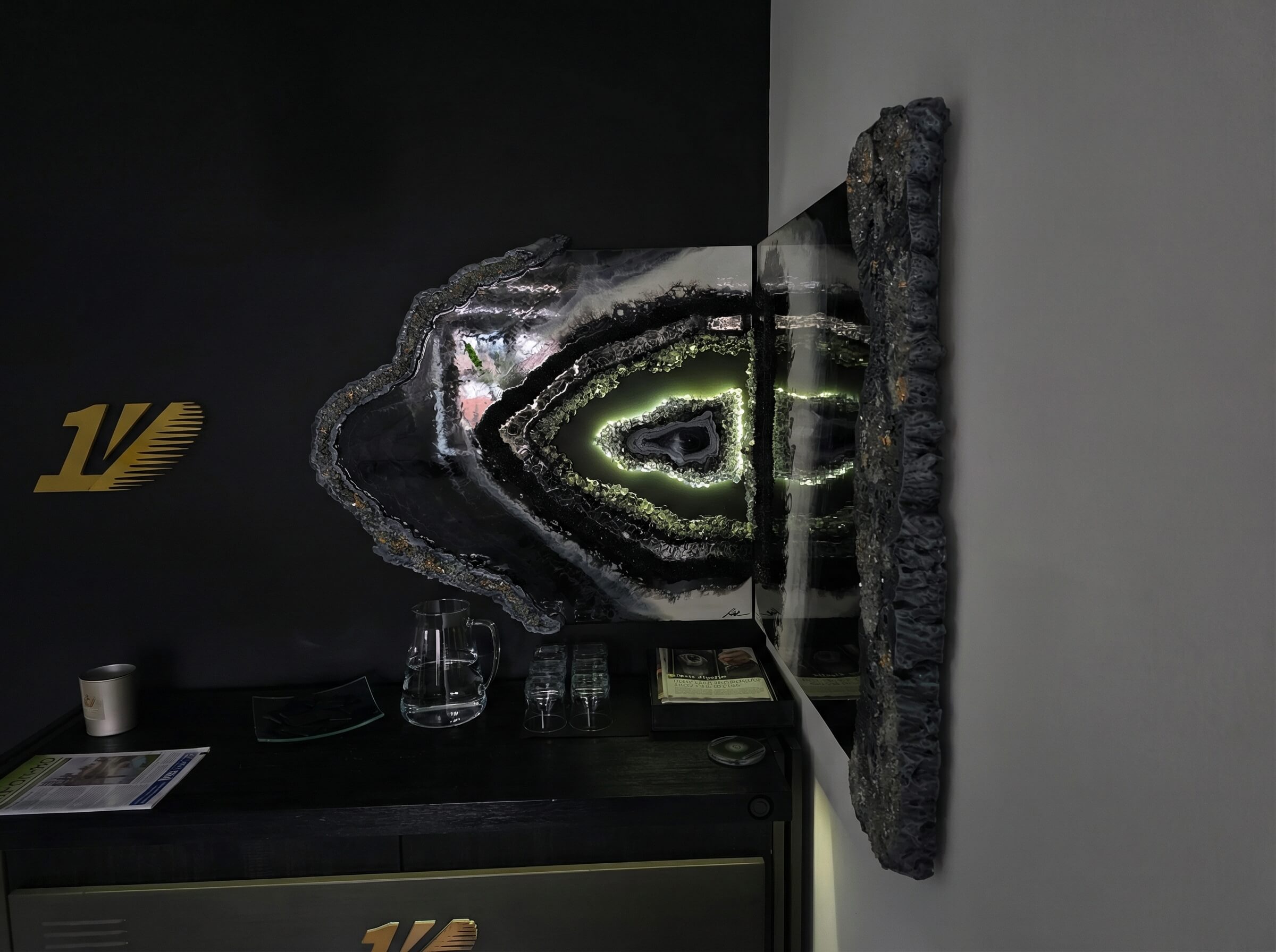 A unique corner piece combining the rawness of crushed glass with the deep gloss of black resin. Built-in LED backlighting emanates directly from the 'fracture' of the artwork, creating a magical atmosphere and a sense of living energy in the interior.