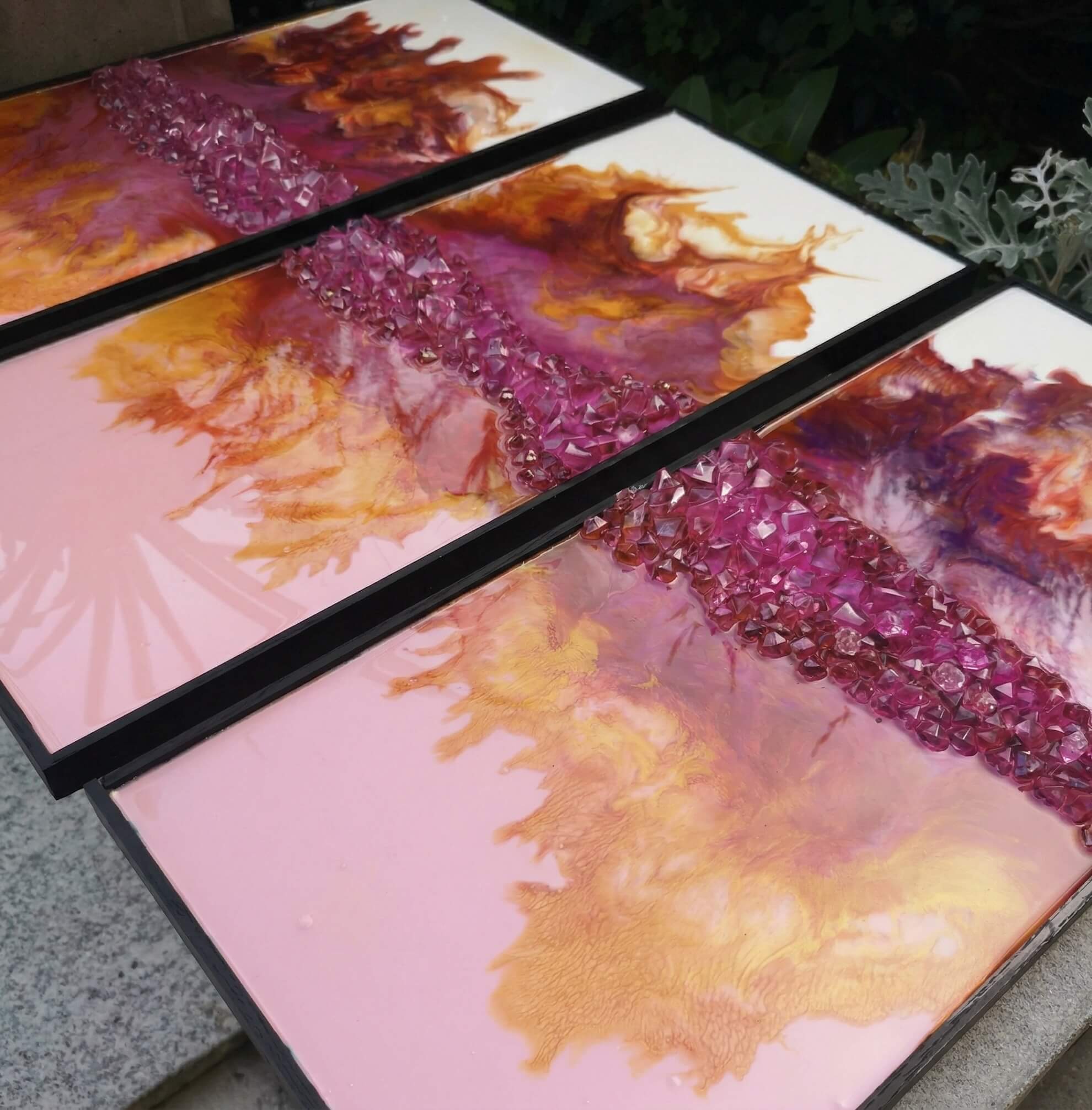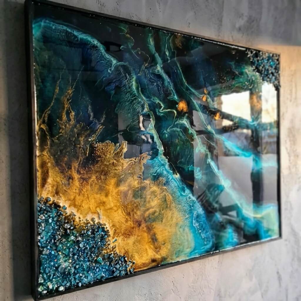 Luxury 3D resin art with glass and minerals. Bespoke large-scale pieces that breathe life into your interior.