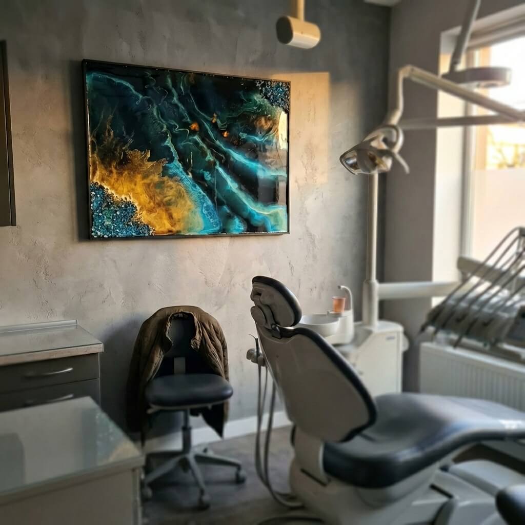 The dynamic combination of crystal resin and crushed glass evokes the calm strength of the ocean. This custom 3D wall art is a perfect example of how luxury resin art elevates professional spaces. The golden details bring warm elegance to a modern clinic interior, creating a sense of harmony for patients.