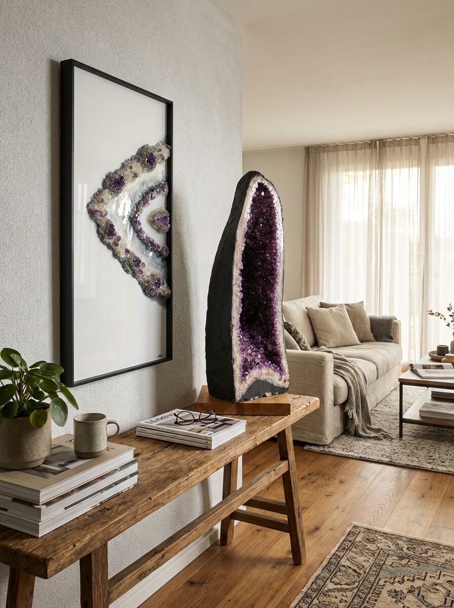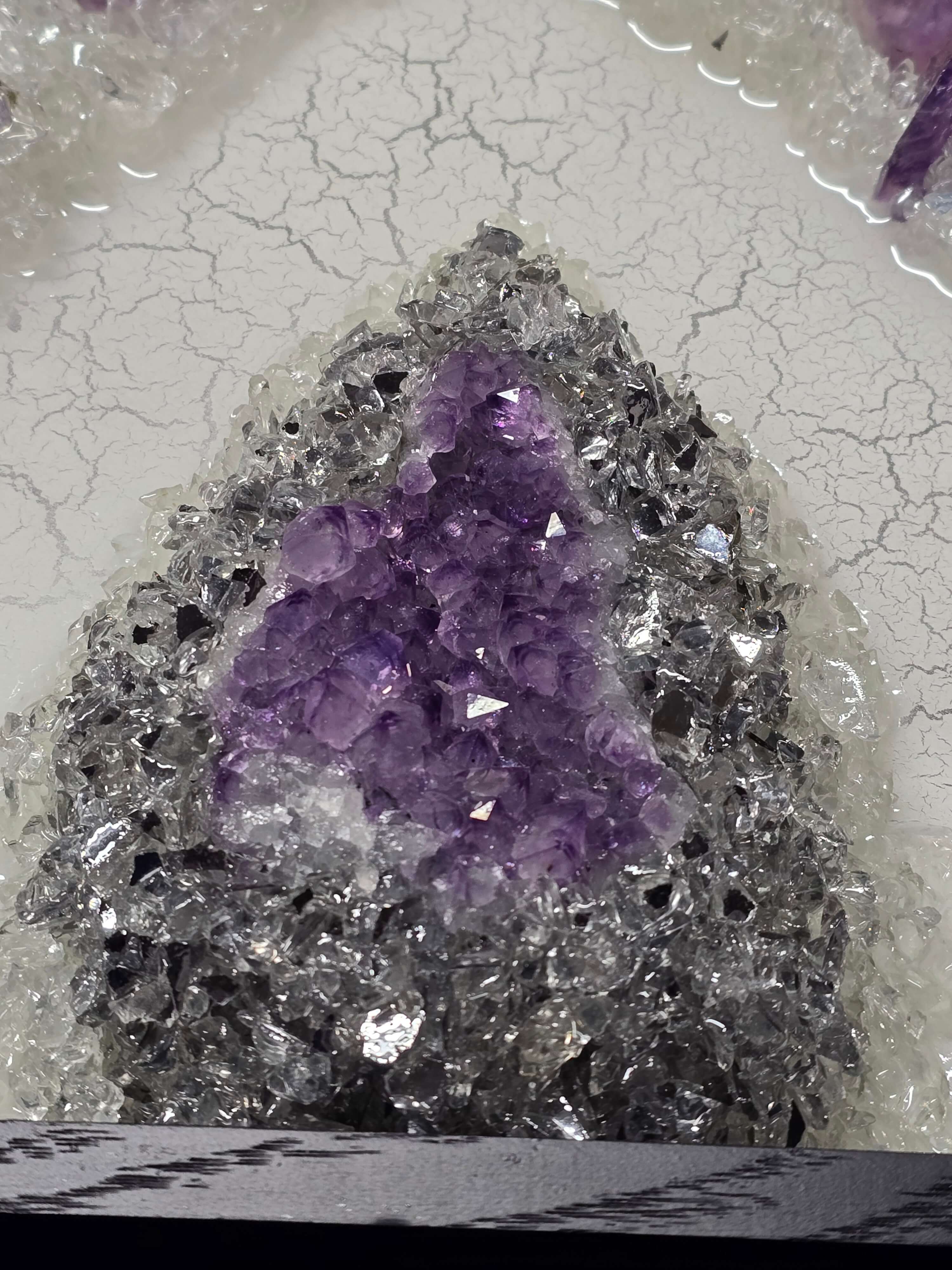 A handmade relief made of resin and real semi-precious stones, celebrating the beauty of nature with its deep structure. The dominant amethyst combined with crystal creates an authentic texture and a fascinating play of light.